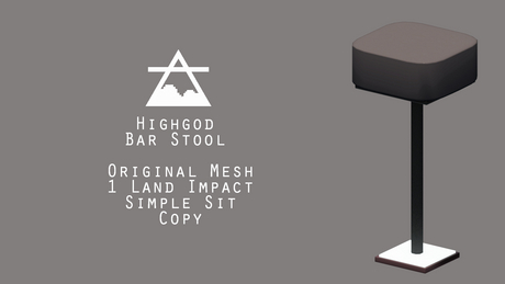 Highgod Bar Stool [Simple Sit]: HighGod original design and textures for second life decor. Bar Stool is 1 land impact. Bar Stool can be copied.